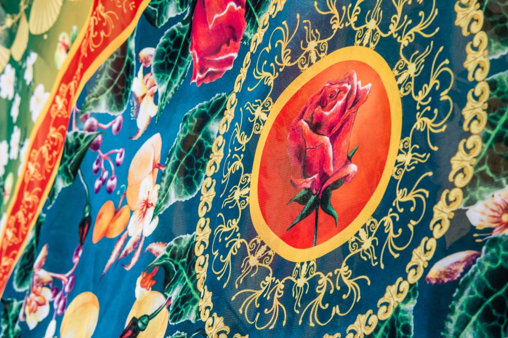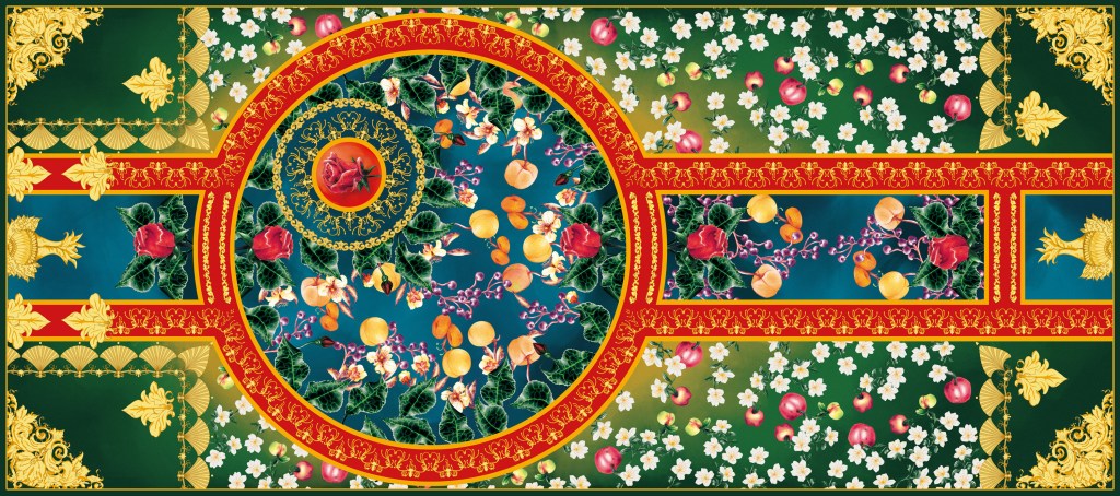 Rosaceae Garden est un projet de design de motif qui célèbre la profonde histoire culturelle entre l’humanité et les plantes de la famille taxonomique des Rosaceae. Des pommes, abricots, pêches et roses sont quelques plantes qui y font partie. Il s’agit de plantes qui ont marqué la peinture, des histoires mythologiques, la gastronomie et les espaces naturels domestiques et sauvages. Cette célébration est matérialisée comme une collection de tissus imprimés sur soie, les motifs sont dessinés manuellement au crayon couleur et imprimés numériquement.