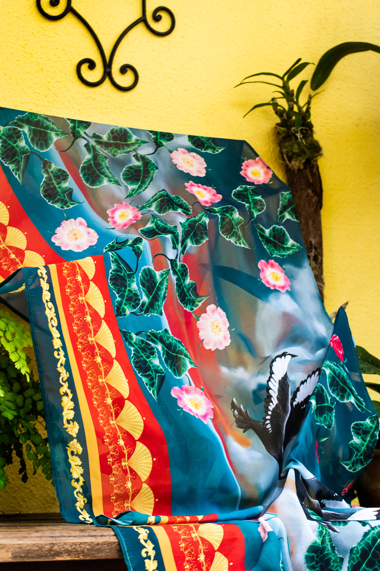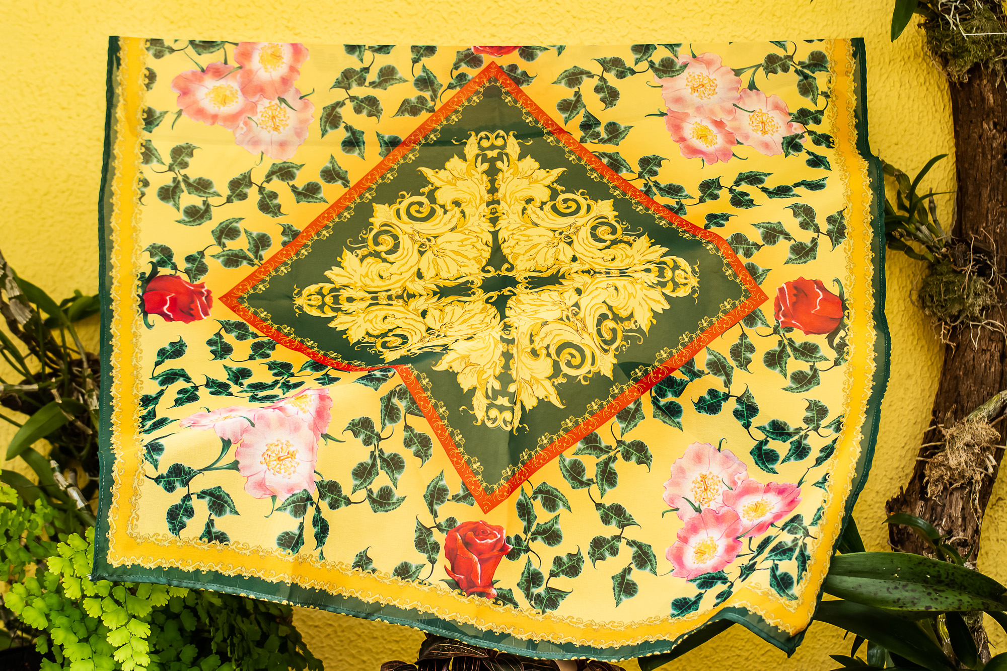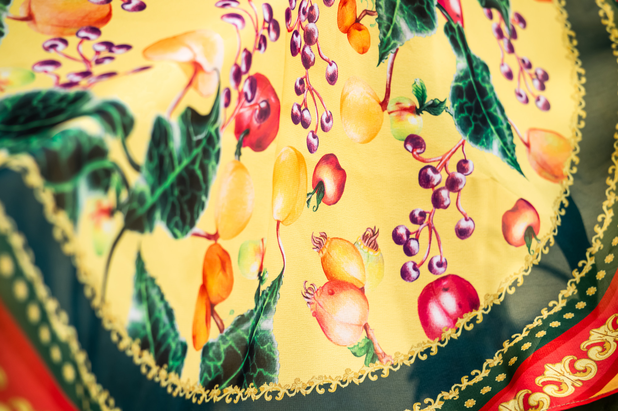 Rosaceae Garden is a pattern design project that celebrates the profound historical and cultural connection of humanity and the plants of the Rosaceae taxonomic family. This family includes apples, prunes, peaches, roses, among others. Those are plants that have marked generations of paintings, mythological tales, gastronomic endeavors and both domestic and wild spaces. This celebration is materialized as a collection of prints-scarves, manually drawn with colored pencils and digitally printed.